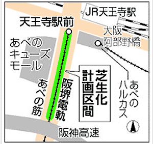 | 今年3月全面完成した大阪市の新名所・・・日本一の高層ビル「あべのハルカス」の足元に、官民一体で「緑のじゅうたん」を敷く計画が進んでいる。 活用するのは、路面電車・阪堺電気軌道の軌道敷。大阪市が長さ600mの範囲に芝生を植え、住民らも維持管理に協力する。人々の憩える「緑の阿倍野」をPRする狙いで、2015年度中にもお目見えする。 ガタン、ゴトン――。ひっきりなしに行き交うレトロな電車の背後に、ガラス張りの現代的なビル。ハルカス南側のあべの筋沿いには、大型商業施設「あべのキューズモール」や商店街もあり、大勢の人でにぎわうが、御堂筋のイチョウ並木のようなまとまった緑はない。 「潤いのある街並みに」と、地元商店街や町内会などでつくる「あべの筋魅力づくり協議会」が声を上げたのは昨年3月。ハルカス以南の約600m区間で、道路の拡幅と軌道の付け替え工事が進められているのに合わせ、軌道敷を芝生化するよう市に求めた。 市も今年5月、議会で900万円の調査費を可決。芝の種類などを検討し、来年度まで予定されている工事の進展を見ながら芝生を植えていくことになった。費用は数千万円から1億円程度が見込まれるという。 ハルカスに近い喫茶店の店長、和田真一さん(39)は「にぎわいは増しても、あべの筋のごちゃごちゃしたイメージは相変わらず。芝生ができれば、街路樹とは違う、特徴のある道になる」と期待する。 ただ、実現しても、芝刈りや水やりといった維持管理には費用も手間もかかる。阪堺電気軌道は「経営が厳しく、負担は難しい」との立場。このため、市は芝の管理を地元団体に委ねる方針だ。維持費の捻出には、都市再生特別措置法に基づく特例を活用することで、道路法で禁止されている路上での広告設置をできるようにし、広告主から入る収益を地元団体に使ってもらう手法などを想定している。 「あべの筋魅力づくり協議会」の乾篤弘会長(73)は「地上に延びる緑のベルトがハルカスから望めると想像すると、ワクワクする。緑が少ない街の印象が一変するはずで、地元を挙げて盛り上げていきたい」と話している。 |