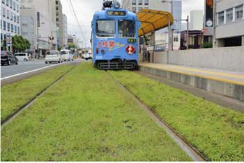 芝生が植えられた土佐電鉄の軌道敷 |