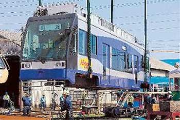 | 搬入されたハイブリッドLRT (高岡市万葉線米島車庫) |