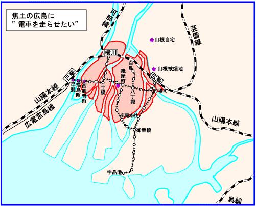 | 1945年8月6日原爆による焼失地域(赤色・半径約2km)と広電路線図 マル紫は焼失後3日目に動かした3電停です |