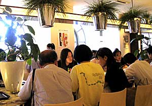 昼食は館内の立派な食堂で学食だ。安い! 向かいは世田谷線とせたがやを良くする会の グループ。路線図と会名を入れたTシャツが・・。 |