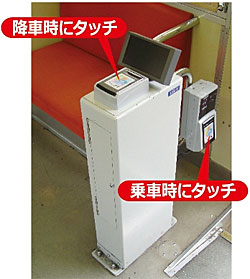 ・これまで乗車専用になっていた中扉からもお客は乗車できる。このために中扉に 降車用のICリーダー機を設置した。 |