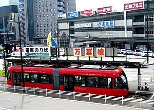 | JR高岡駅に下車する。真ん前の万葉線に 乗車し、広小路に下車すると電停前が会場だ |