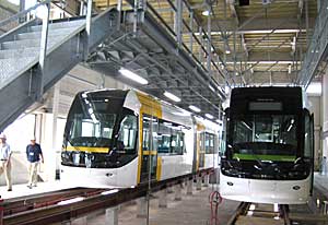 城川原電停に隣接する富山ライトレール車庫 皆さんの関心はピットに潜り直結動力を実物見学 |